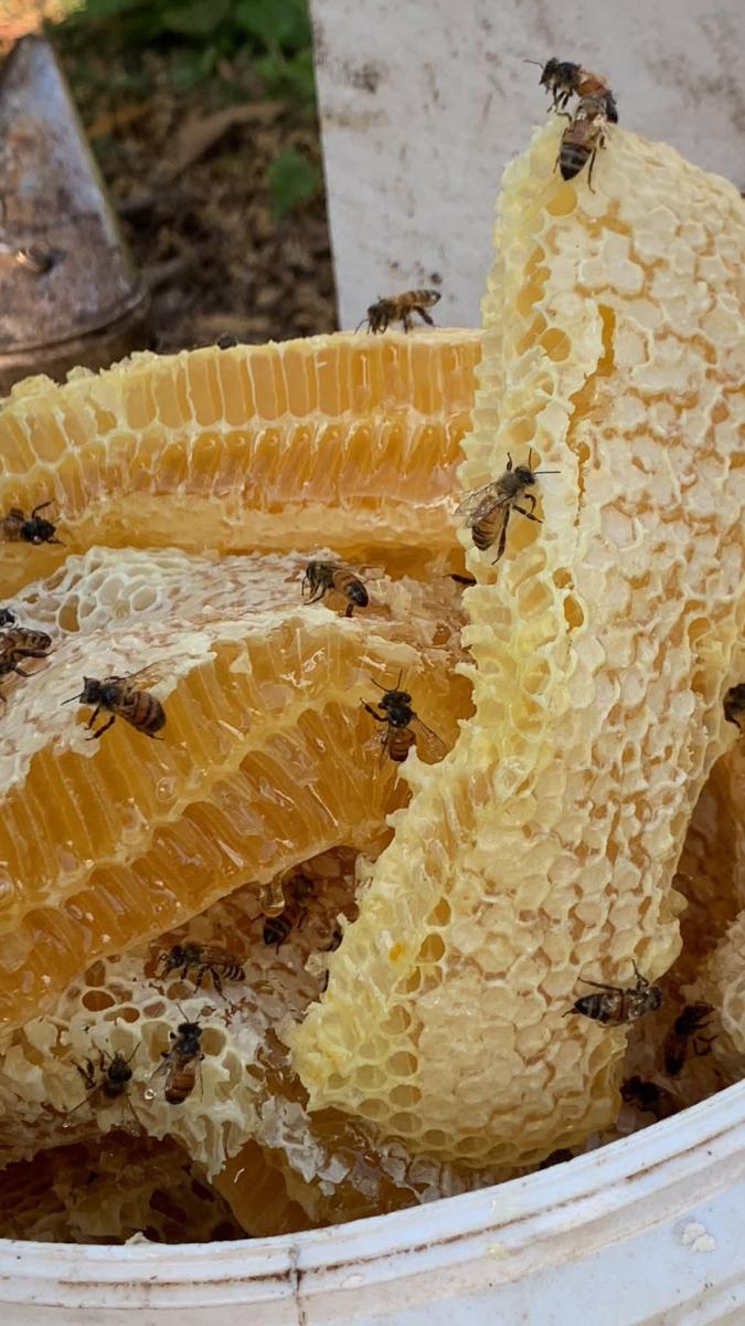 Harvesting honey. Available products include raw filter honey, honey on comb, bees wax, KTB hives, and tools